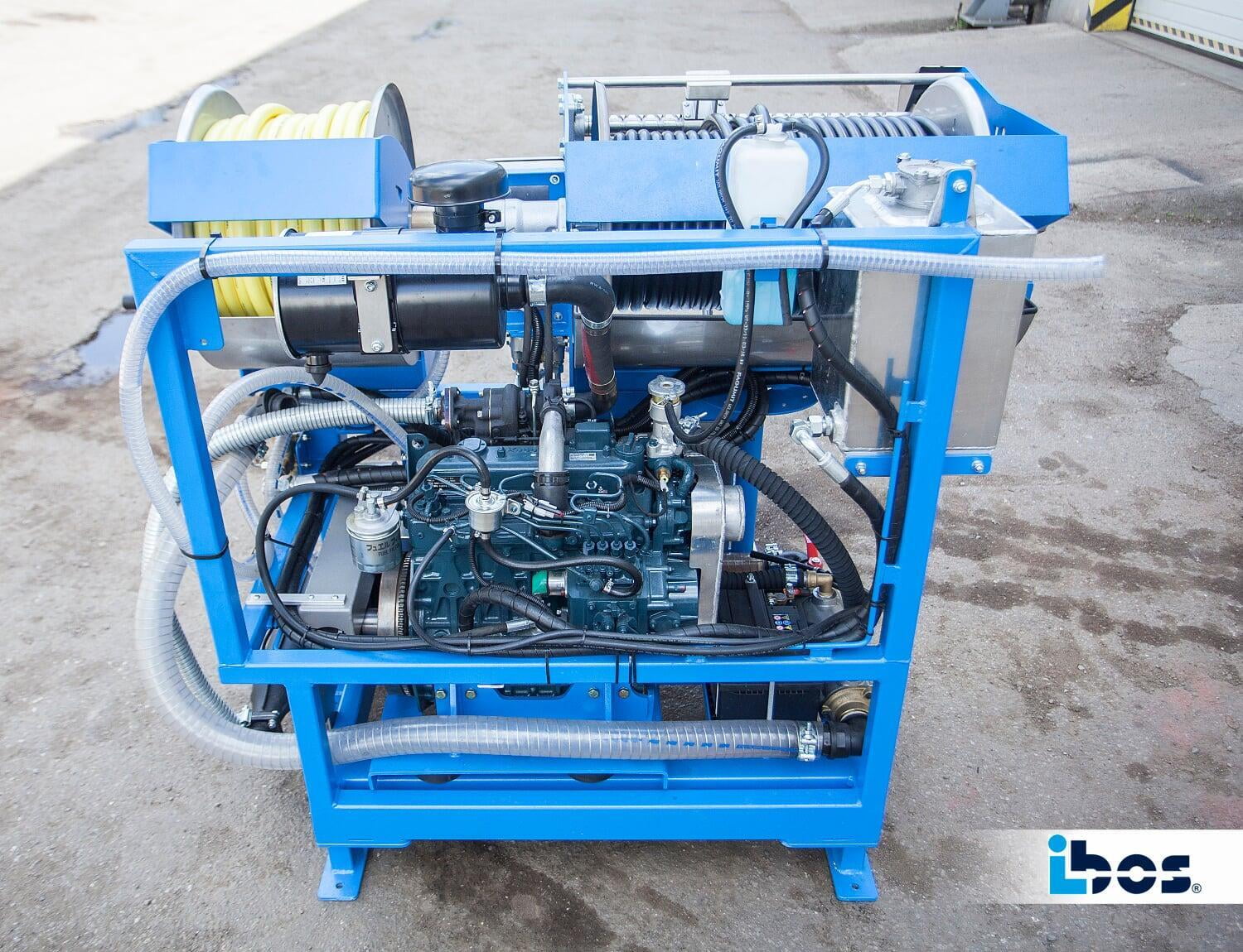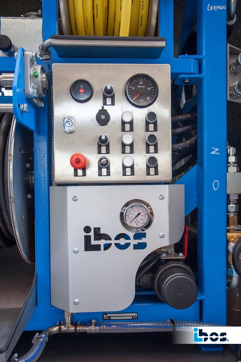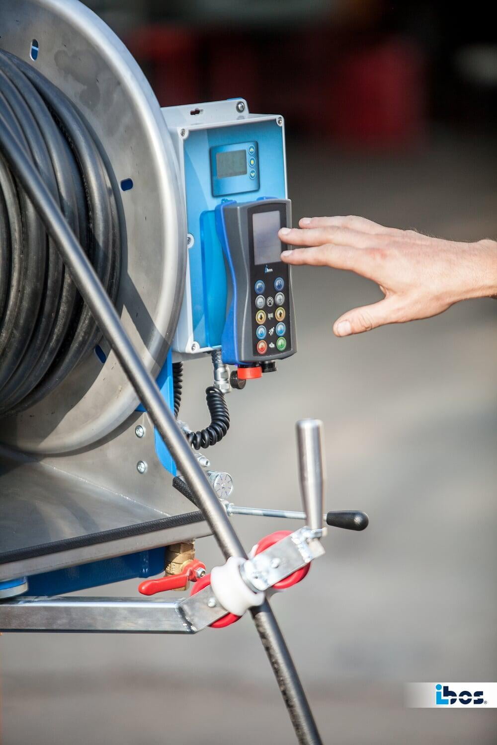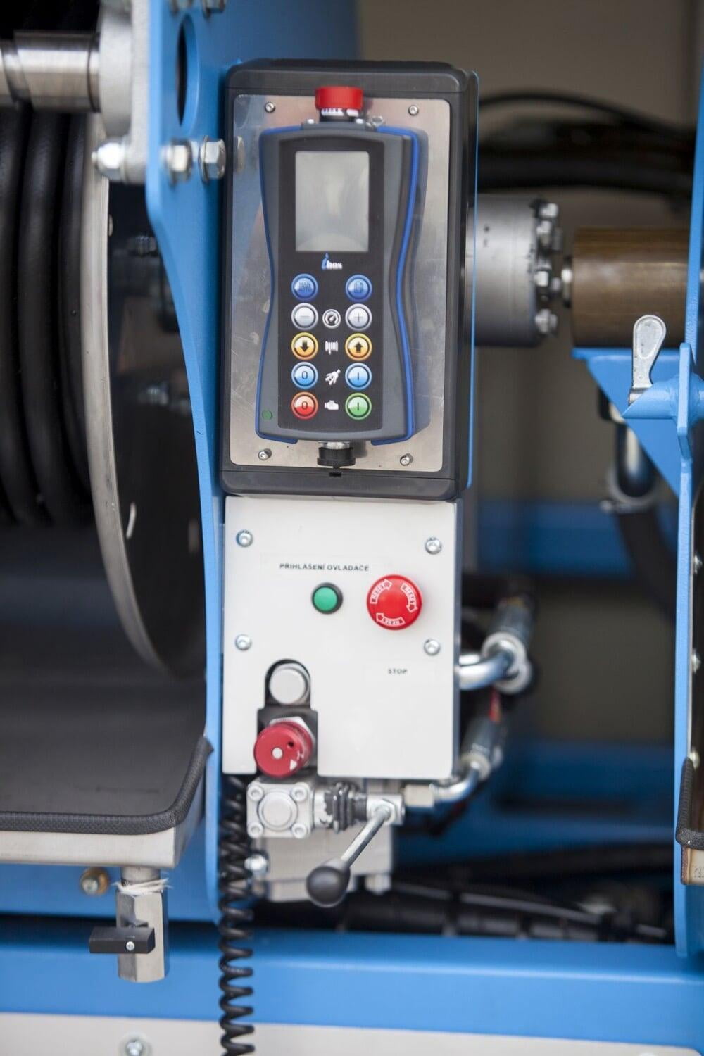 - Funkfernbedienung mit bis zu 100 m Reichweite im freien Raum, Steuerung von Motordrehzahl und Druck, Hydrauliksteuerung, Notaus