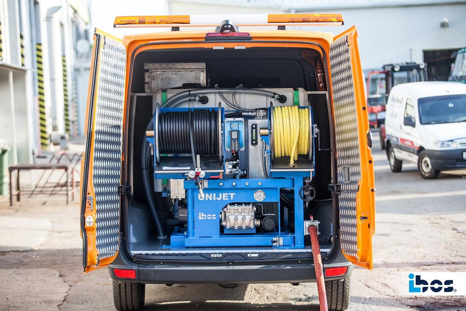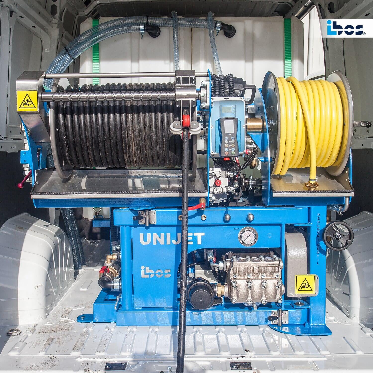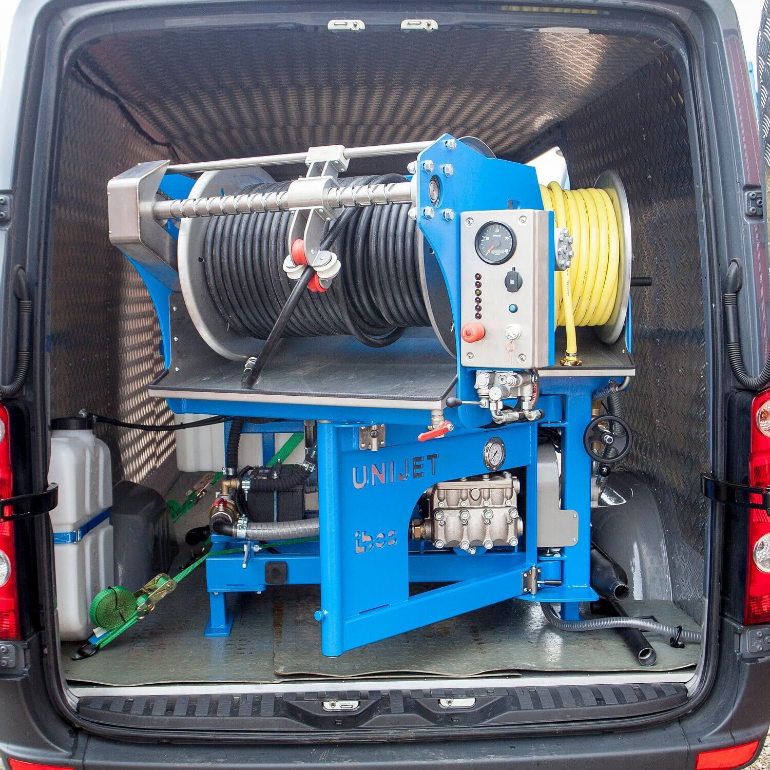 - Funkfernbedienung mit bis zu 100 m Reichweite im freien Raum, Steuerung von Motordrehzahl und Druck, Hydrauliksteuerung, Notaus